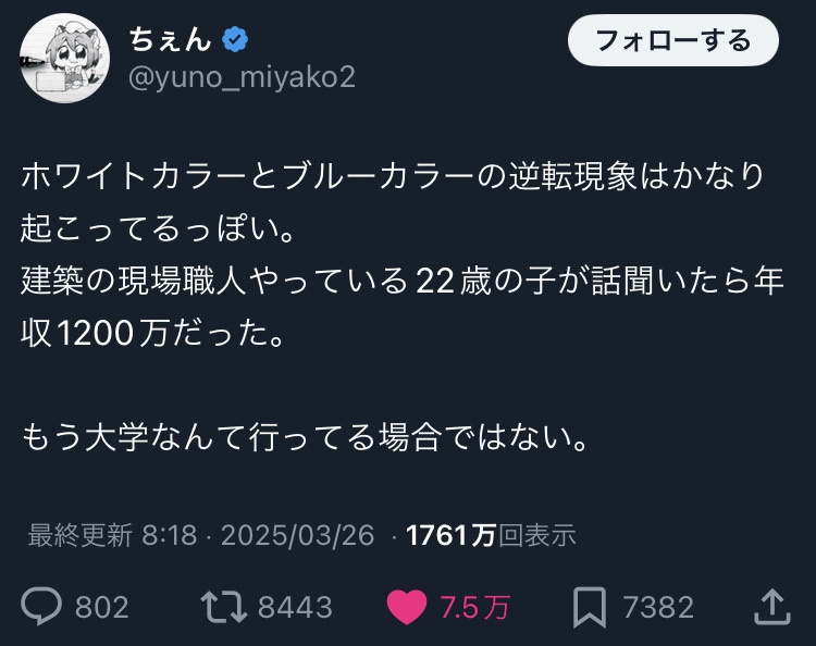 【悲報】漫画アイコン「22歳。建築職人。年収1200万円。ホワイトカラーとブルーカラーの逆転現象が始まった」←これマジ?