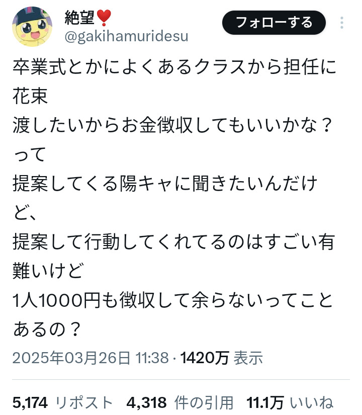【悲報】陽キャ「先生に花束送るから一人1000円ね!」陰キャ「一人1000円も徴収する意味ある?」