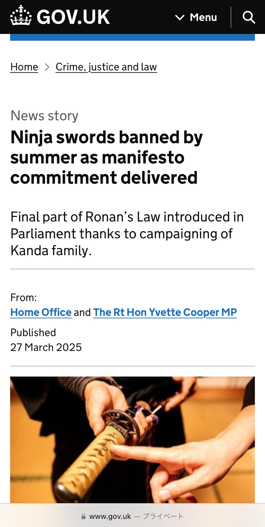 【悲報】イギリス政府、日本刀を禁止へ「なんだいこれは?危険すぎるよ」
