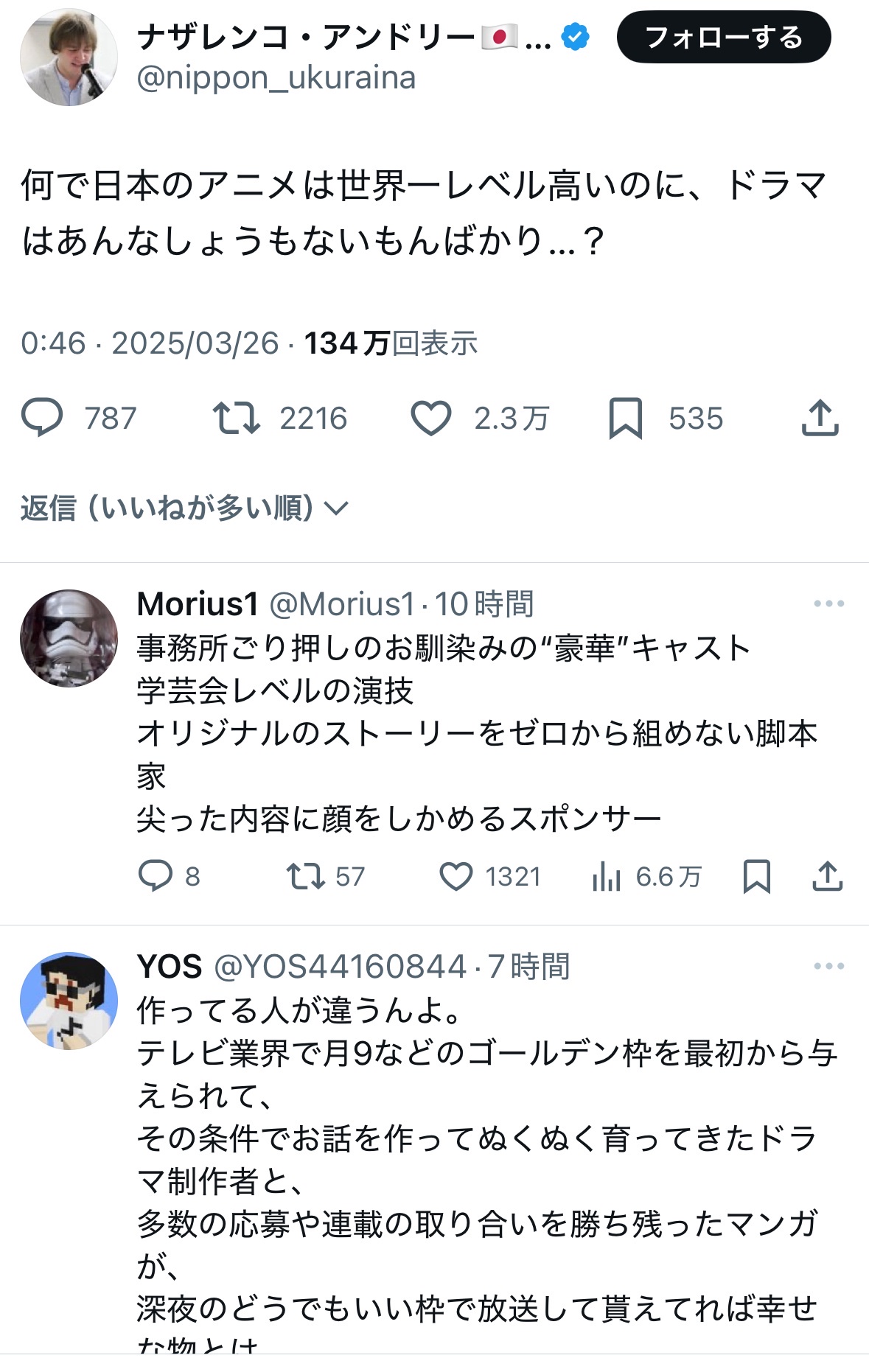 【悲報】識者「日本のアニメは世界一レベル高いのに、なんでドラマはしょーもないのばかりなの…?」