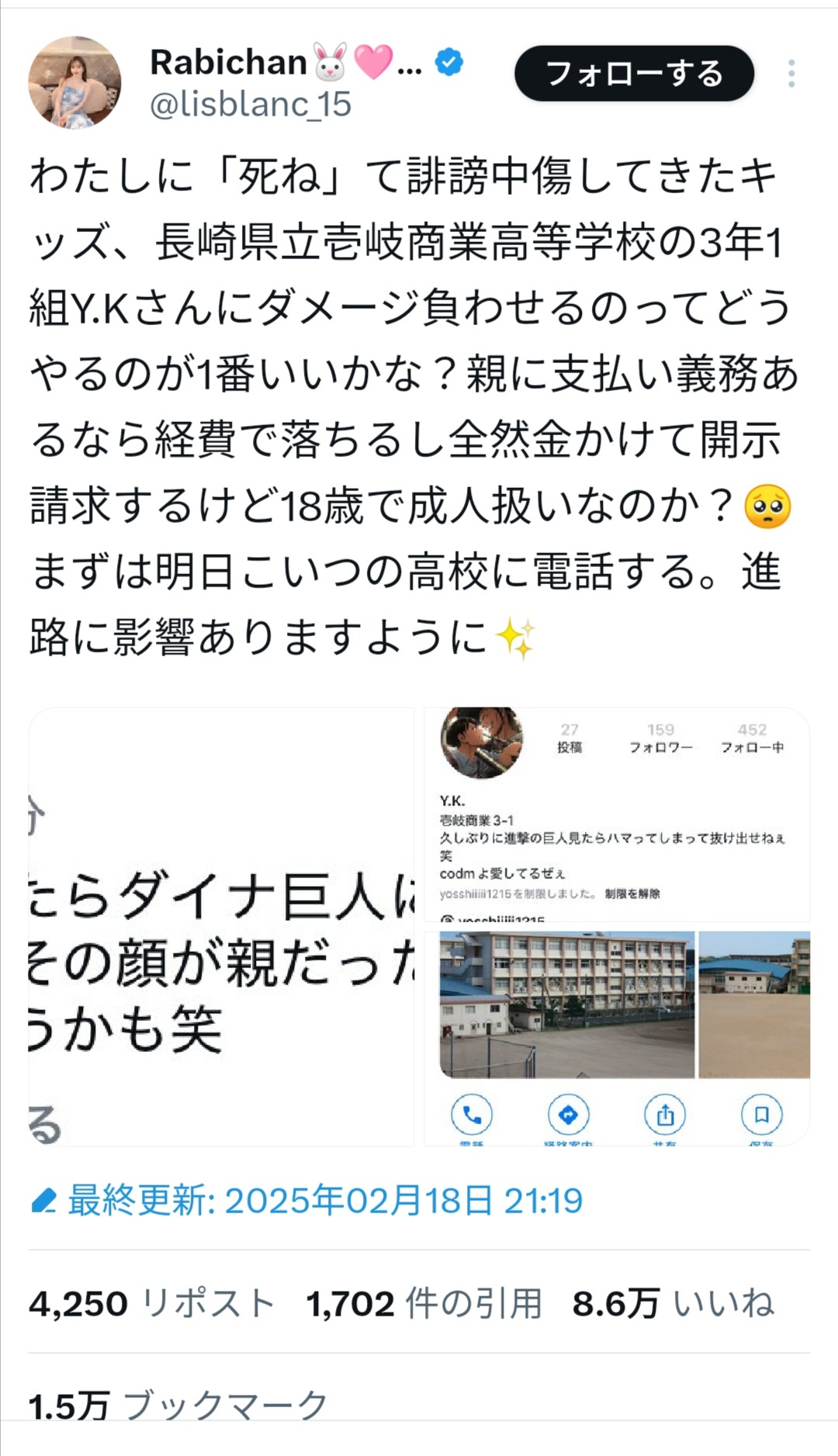 【画像】高3キッズ、整形系YouTuberに誹謗中傷をして学校に通報されるwwww