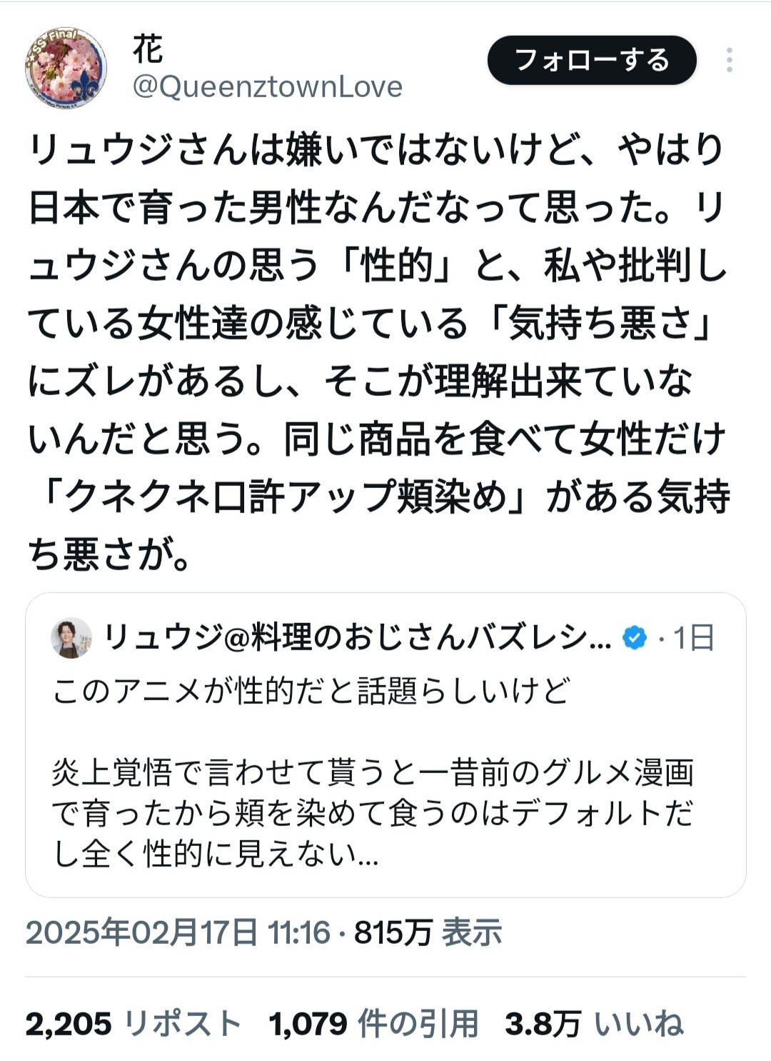 【悲報】アニメ業界人「食事シーンは性的描写と地続き。嫌悪感がある人が多いのもそれが影響してる」