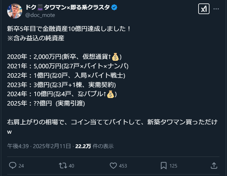 【画像】新卒5年目に「資産10億」達成したX民、現れるwwww