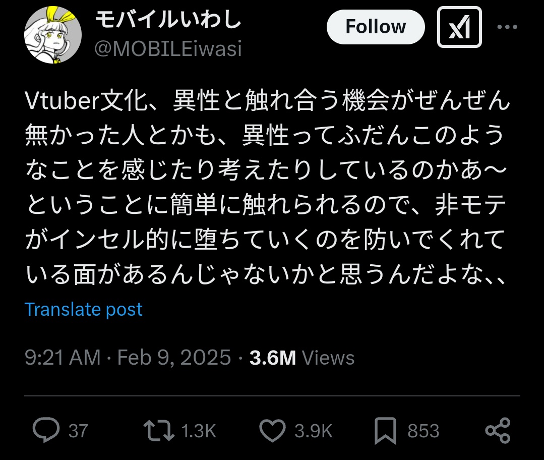 【悲報】Vオタク「VTuberは女の考え方を教えてくれるから非モテになるのを防いでくれるんだよなぁ(ニチャァ」有識者「…」