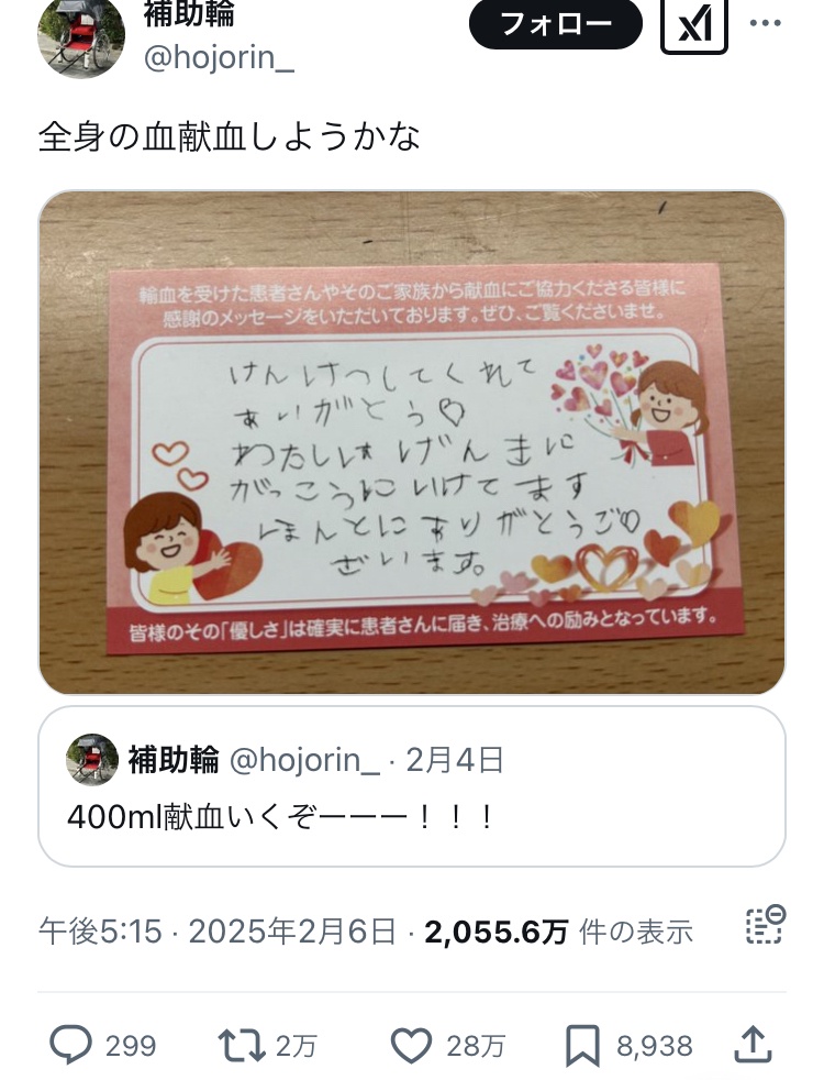 【画像】X民「献血行ったらお手紙もらった」→萌えポスターより効果的だと絶賛されるwwww