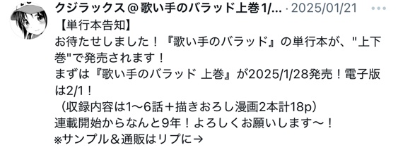 【朗報】クジラックス先生の「歌い手のバラッド」、連載開始から9年も経過していたwwww