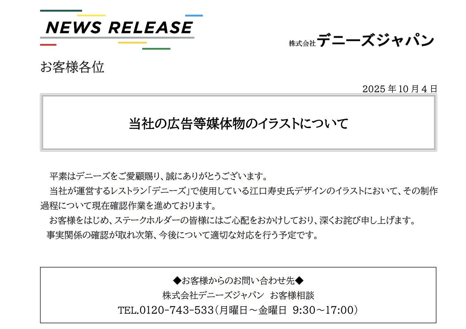 【悲報】デニーズ、トレパク疑惑の漫画家のイラストを使用中止にするwwww