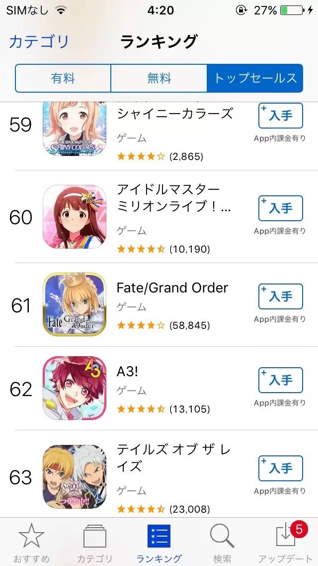 【悲報】FGOさん、ついにセルラン61位まで落ちてしまう