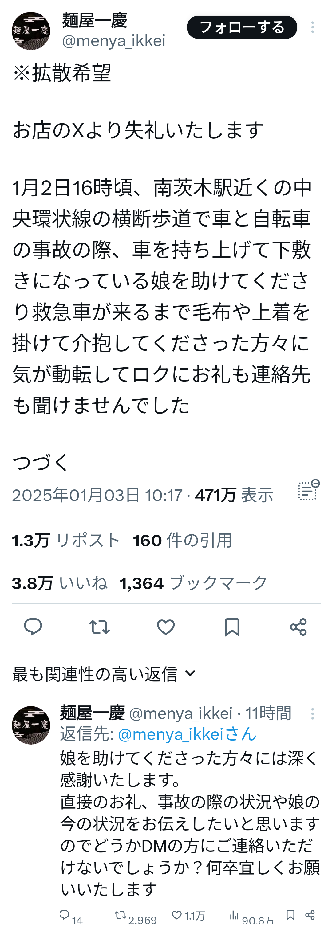 【捜索】ラーメン屋さん「事故に遭った娘を助けてくださった方、ご連絡いただけませんか?」