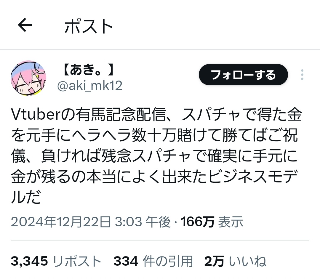 【悲報】アニメアイコン「VTuberの競馬配信って良いビジネスモデルだよな」←めちゃくちゃ叩かれるwwww