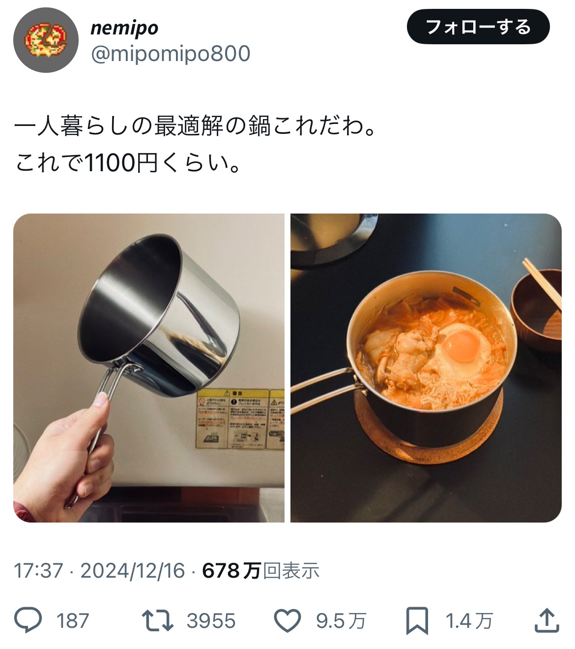 【画像】識者「一人暮らしの最適解の鍋これだわ(パシャ」9.8万イイネ
