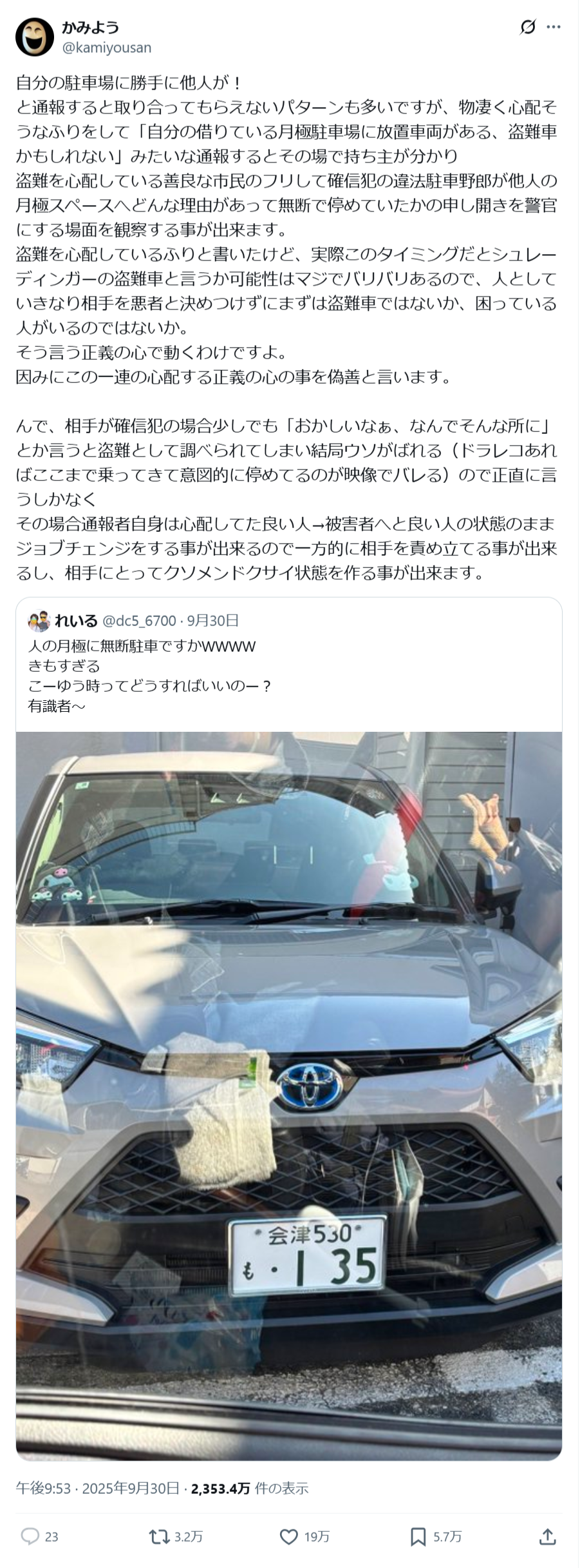【悲報】X民「自分のスペースに無断駐車された。どうすればいい?」識者「…」