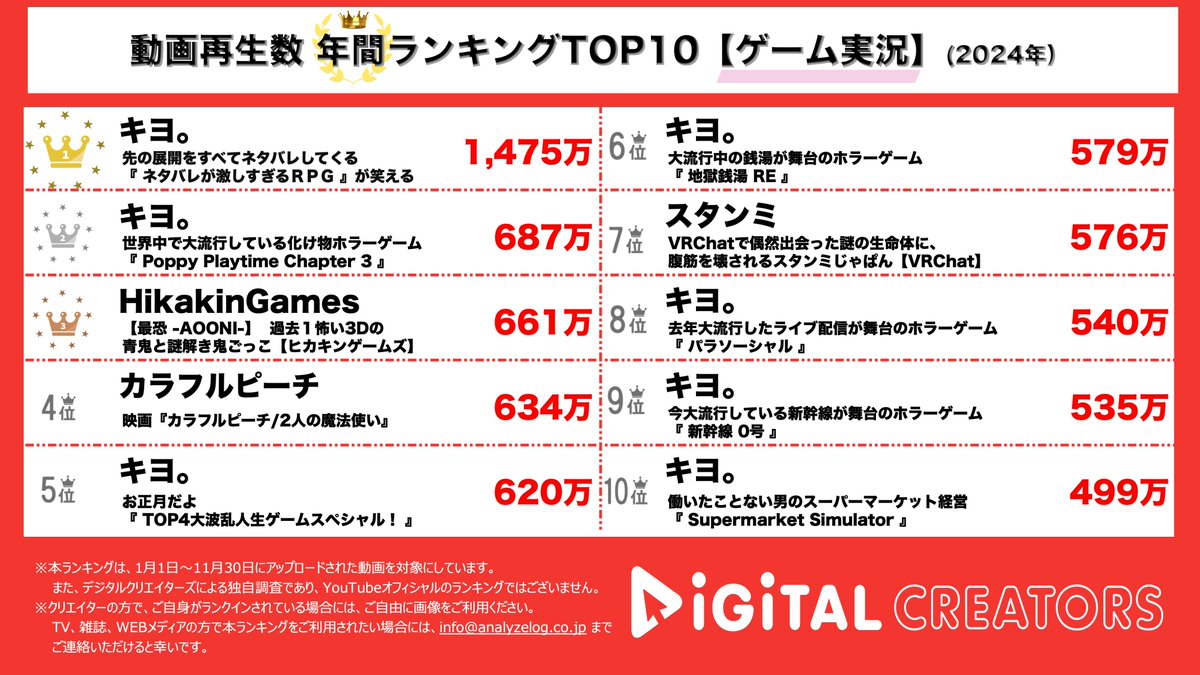 【画像】2024年YouTubeゲーム動画ランキング、たった一人に無双されるwwww
