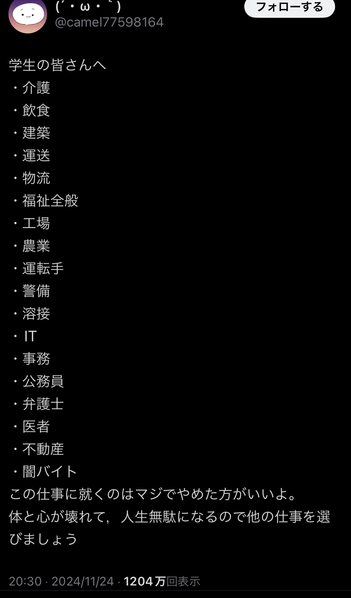 【画像】識者「学生の皆さんへ。これらの仕事に就くのは人生の無駄。やめた方がいいよ」