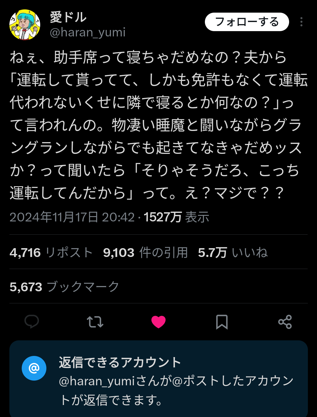 【悲報】女さん「助手席で寝てたら運転中の夫にキレられた。え?マジで?」