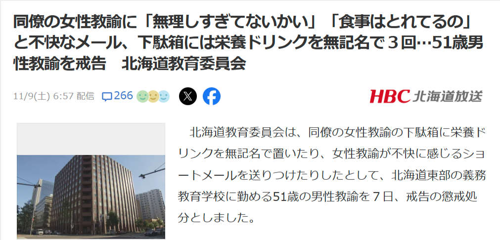 【悲報】中年教師「がんばりすぎてない?大丈夫?(栄養ドリンク差し入れ)」女性教師「キモッッ」→戒告へwwww