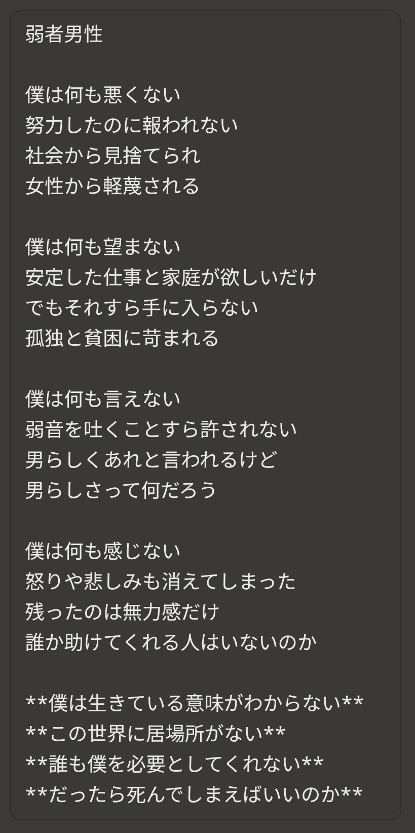 【画像】AIに「弱者男性」になりきってもらった結果wwww