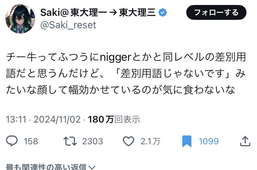【画像】アニメアイコン東大生「チー牛って黒人差別と同レベルの差別用語だろ」