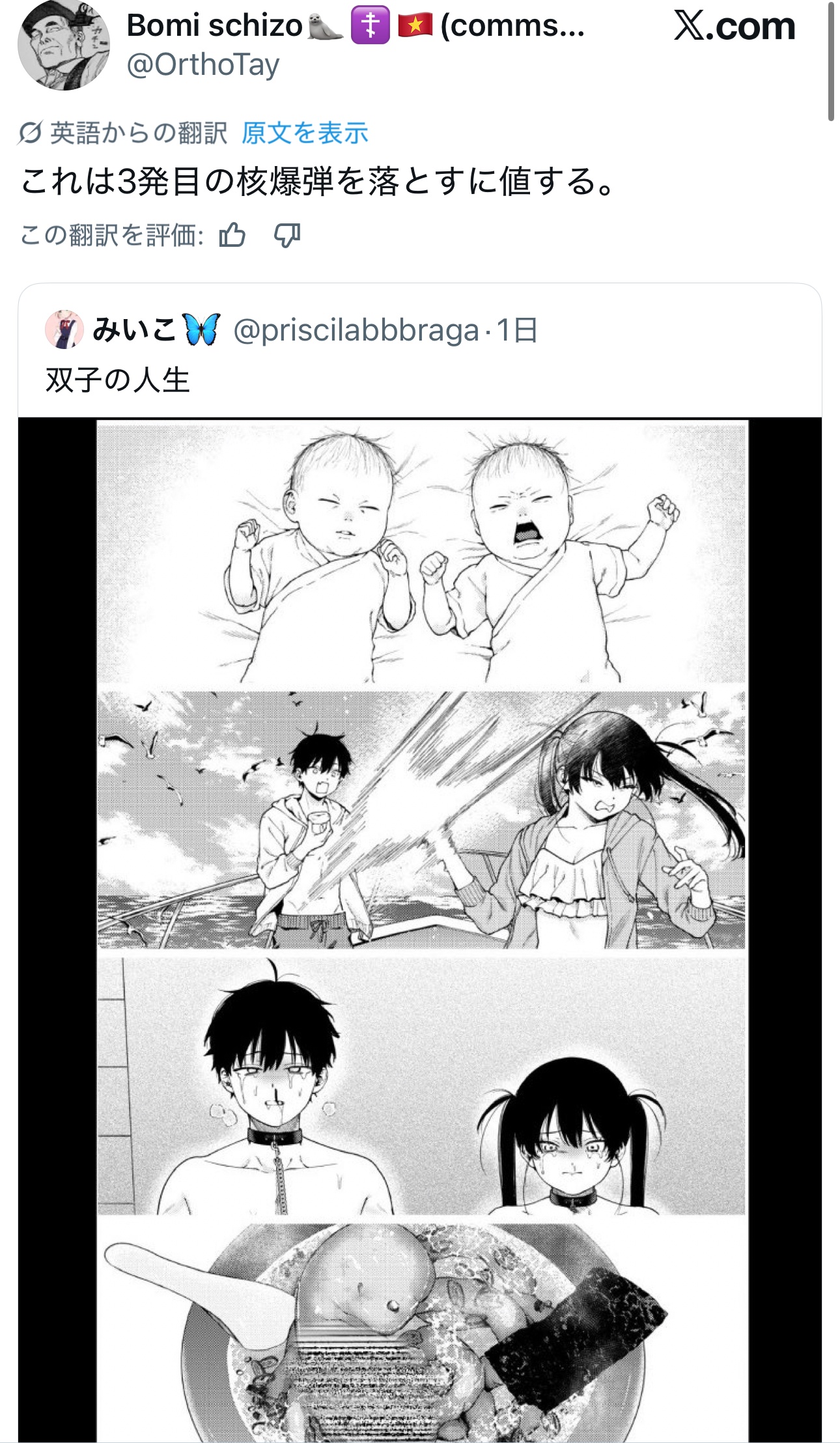 【悲報】この漫画に外人ブチギレ「日本は三発目の核爆弾を落とされるべき」