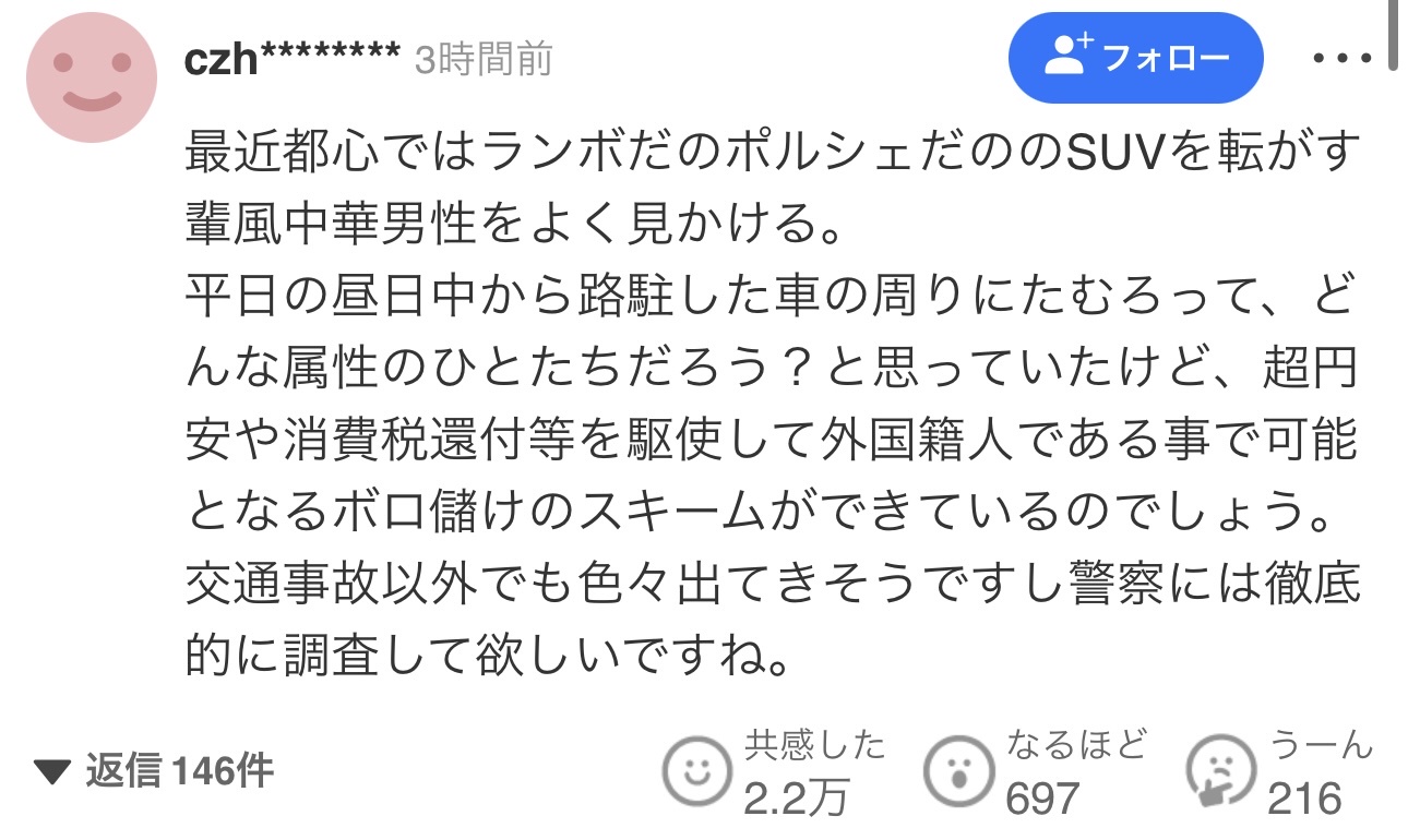 【悲報】日本人、中国人が都心で超高級車を乗りまわし悠々自適な生活をしていることに気付き発狂wwww