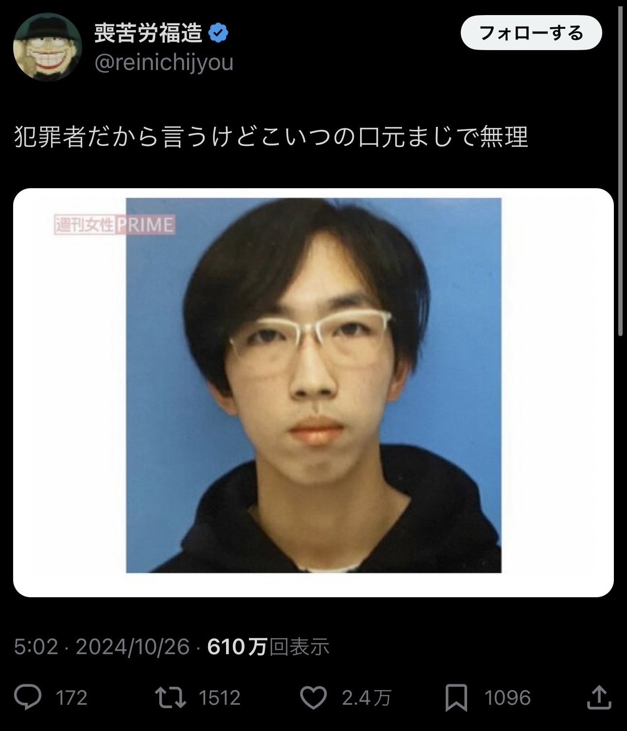 【悲報】アニメアイコン「犯罪者だから言うけどこいつの口元まじで無理w」