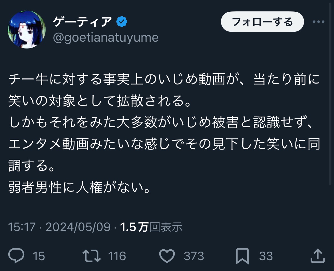 【悲報】アニメアイコン「チー牛には人権がない。いじめ動画もエンタメ化されてしまう」