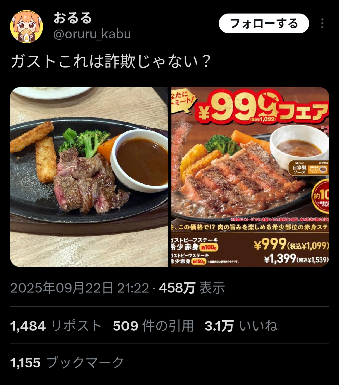 【悲報】アニメアイコン「ガストのステーキ、写真詐欺じゃない?」