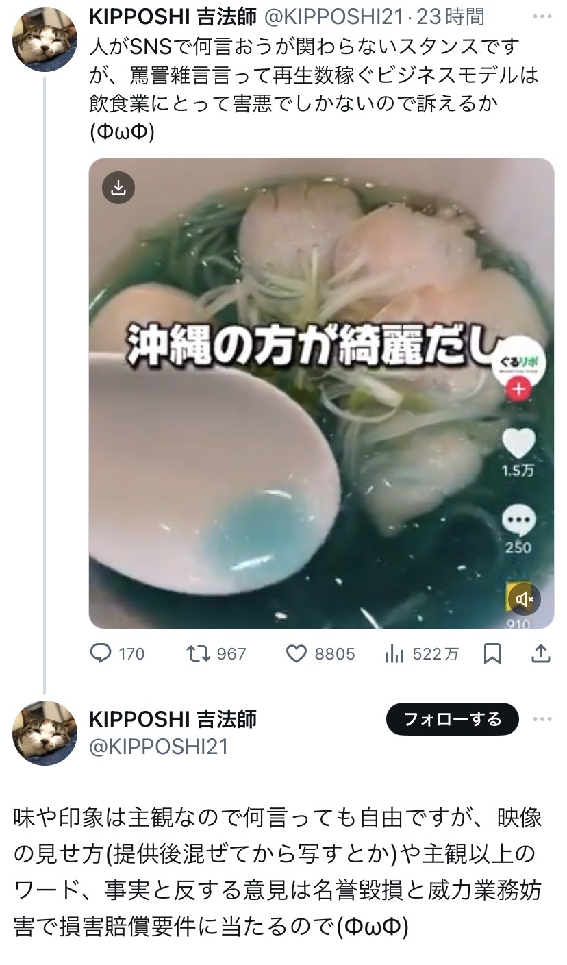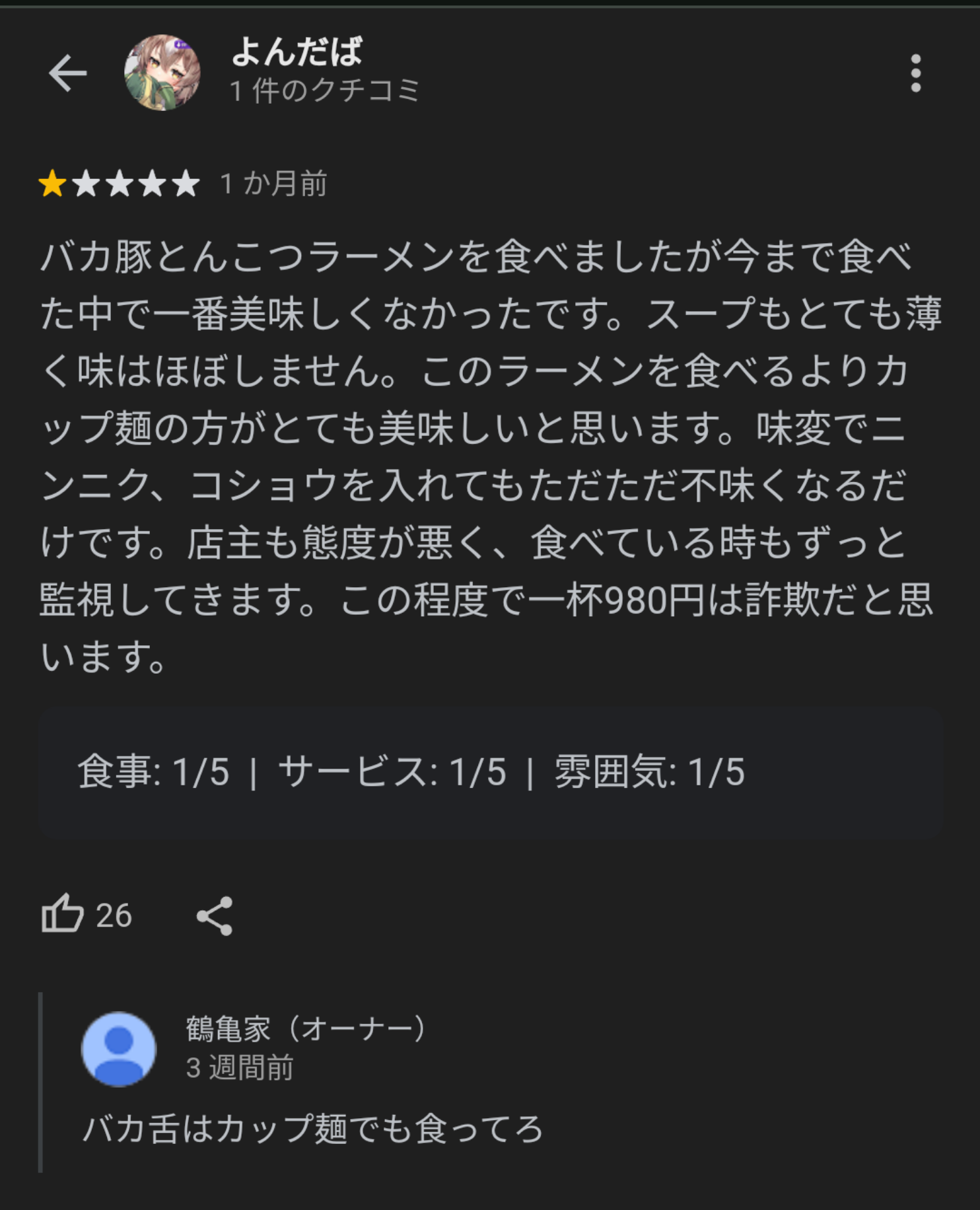 【悲報】グルメ系動画配信者「ここのラーメンまずい!」ラーメン屋「こいつ訴えます。」