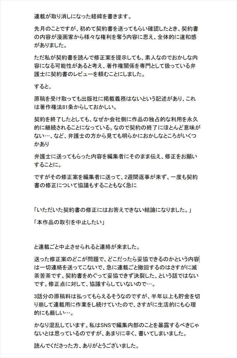 【悲報】漫画家「契約書の修正をお願いしたら、連載取り消しになりそう。誰か助けて…」
