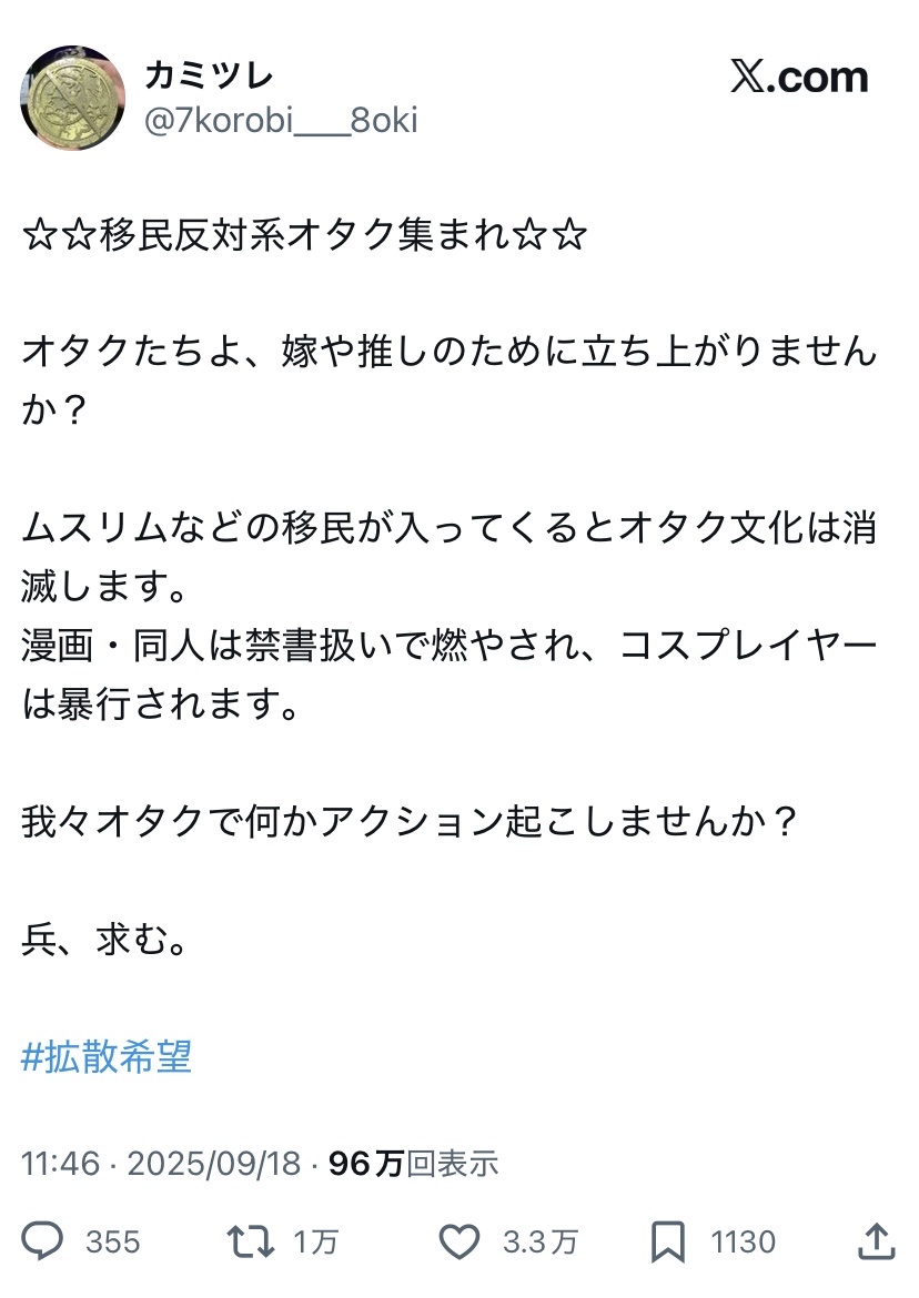 【悲報】移民反対系オタク「移民を入れるとオタク文化が消滅するぞ!オタクは今こそ行動を起こそう!」→3.3万イイネ