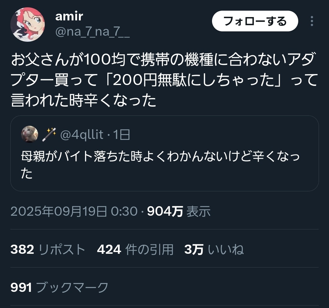 【悲報】アニメアイコン「お父さんが100均で携帯の機種に合わないアダプター買って『200円無駄にしちゃった』って言われた時辛くなった」