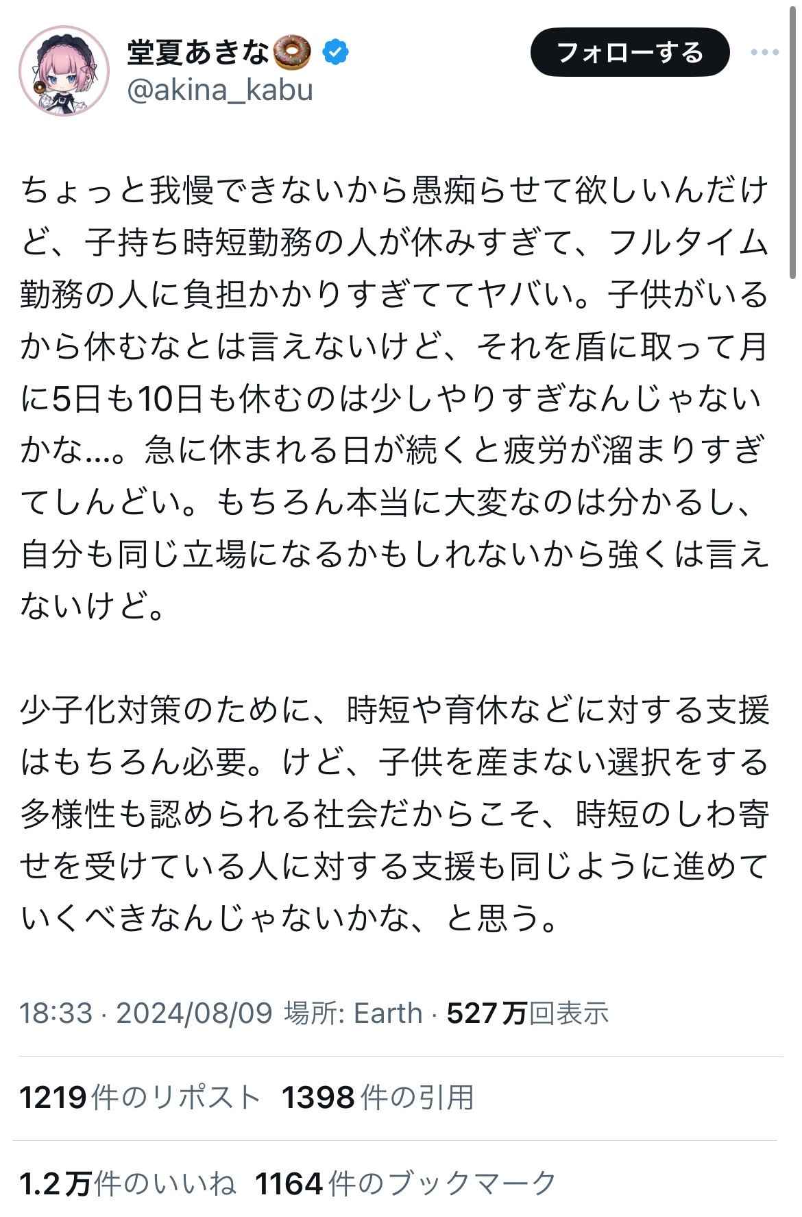 【悲報】アニメアイコン、子持ち女性に苦言「子持ちが休みまくるせいで皺寄せが来てしんどい。私たちにも支援しろ!」←これ正論じゃね?