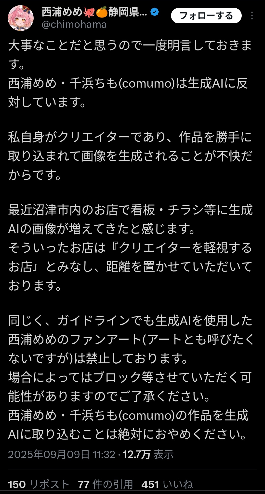 【悲報】沼津市公認VTuber、画像生成AIを使う店の案件をお断り「AI画像を使ってる店は『クリエイターを軽視するお店』とみなします」