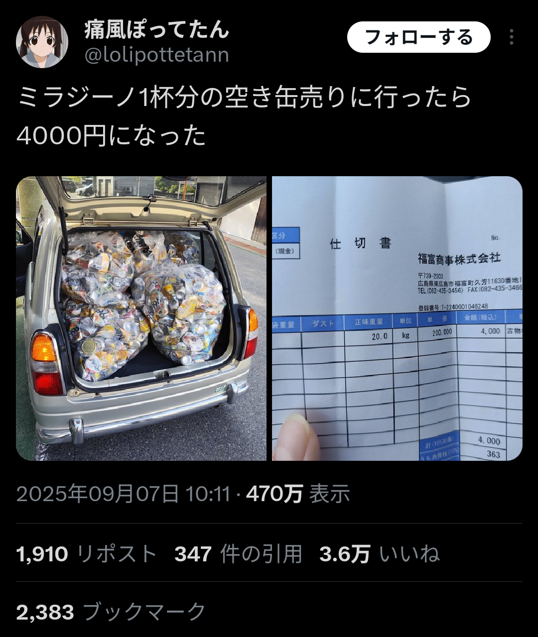 【悲報】アニメアイコン「車いっぱいに空き缶貯めたから売りに行くわ」→衝撃の結果にwwww