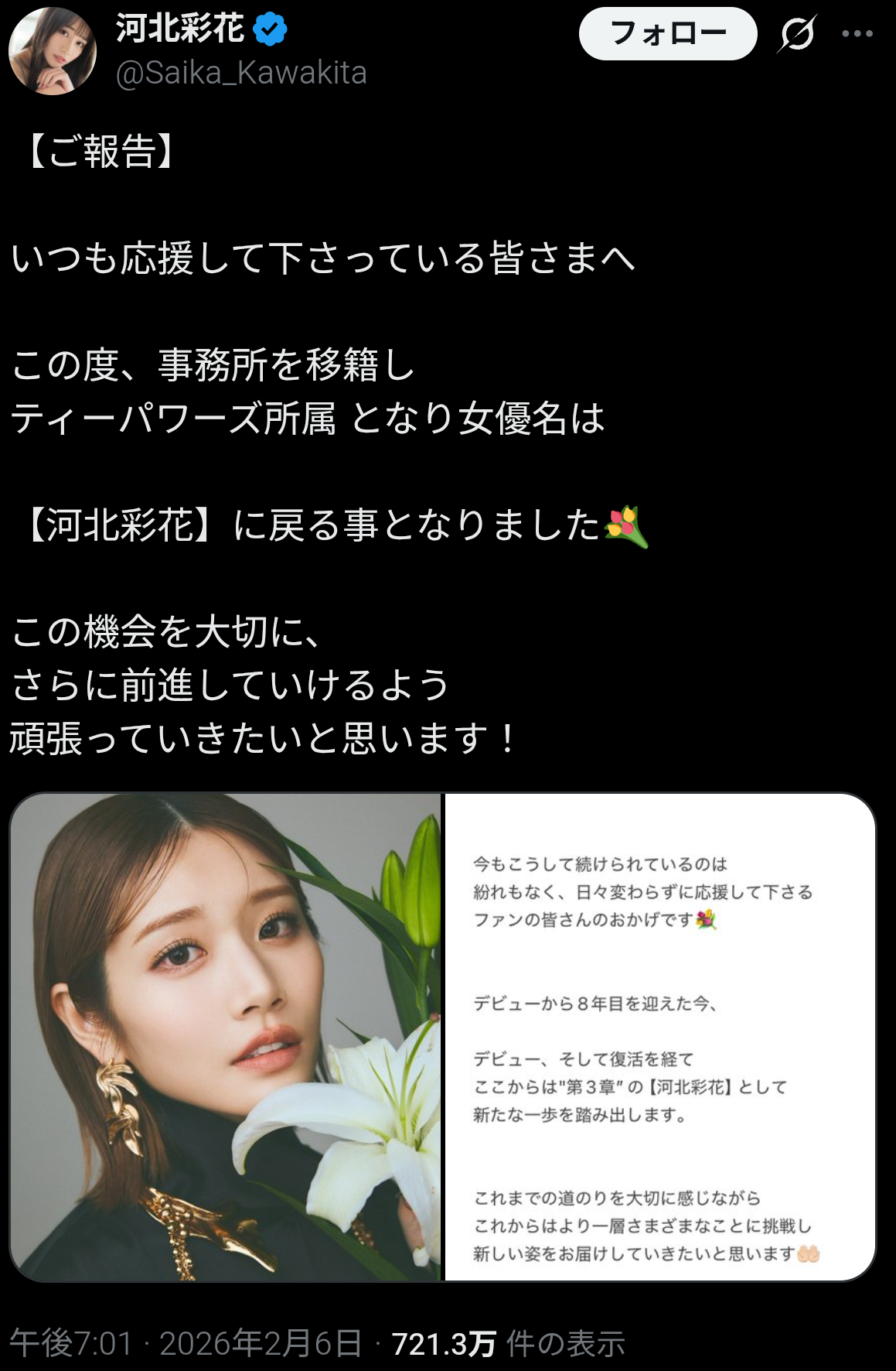 【画像】大人気セクシー女優「【ご報告】 いつも応援して下さっている皆さまへ」