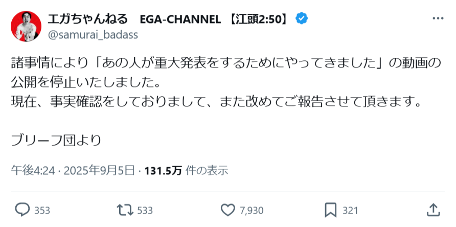 【悲報】エガちゃんねるの「例のポテチ動画」、公開停止wwww