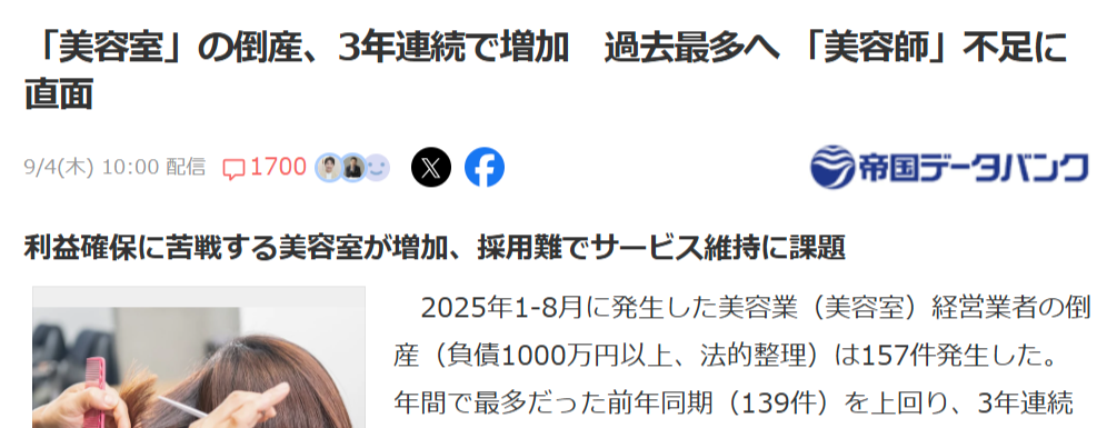 【悲報】「美容室」の倒産が過去最多へ!チー牛をバカにして客として取り込まなかったせいかな?wwww