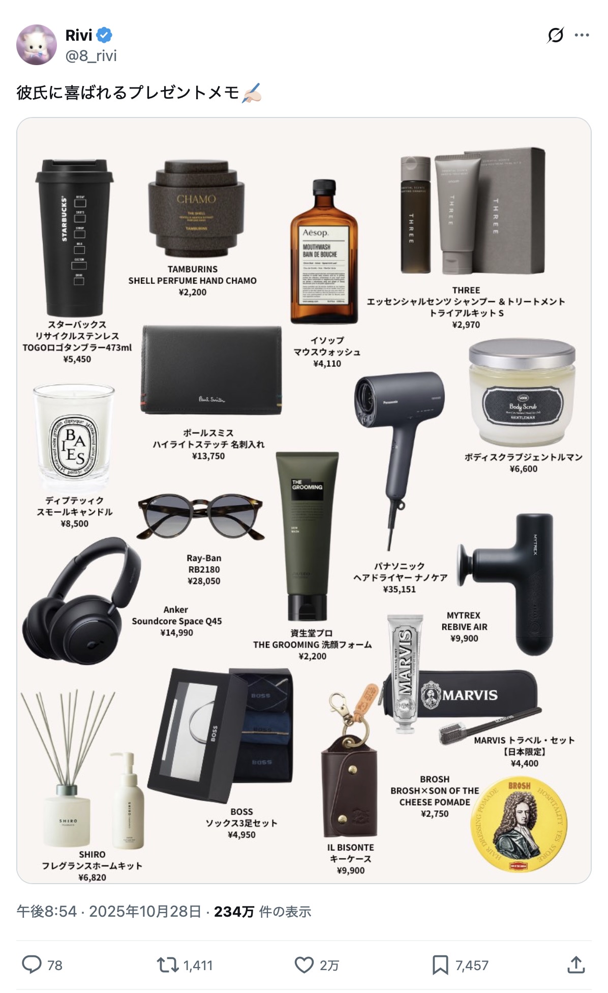 【画像】女さん「彼氏に喜ばれるプレゼント一覧がこれです!」→2万イイネwwww