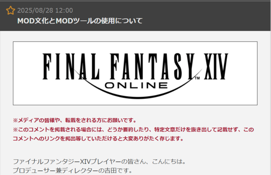 【悲報】FF14プロデューサー、「MOD」にお気持ち表明するwwww