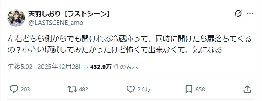 【疑問】人気アイドル「左右両開きの冷蔵庫って、同時に開けたら扉落ちてくるの?」→2万イイネ wwwww