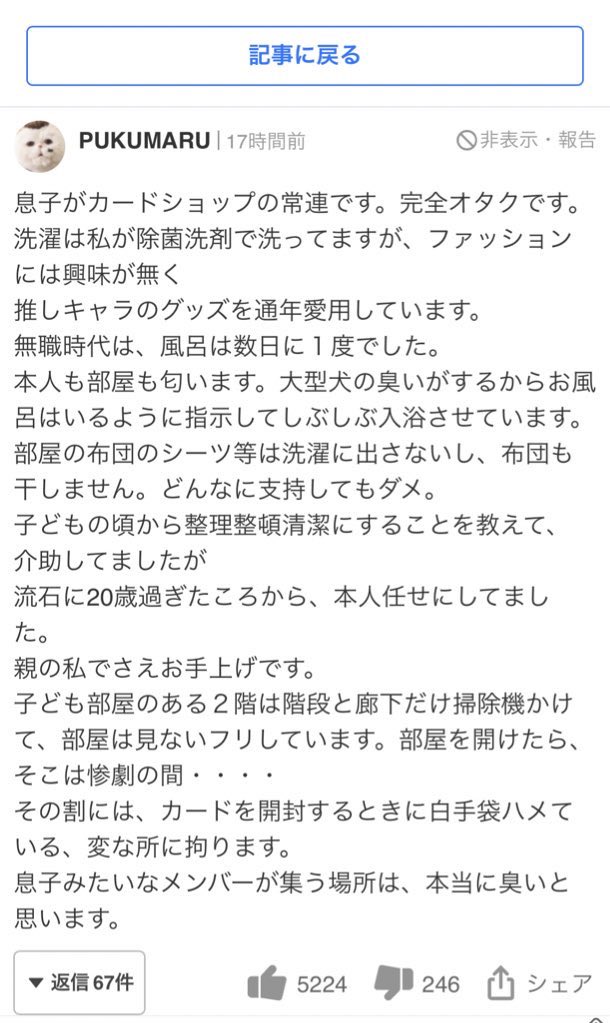【悲報】カードゲーマーの息子を持つ母親、悲惨過ぎて草「風呂に入らず大型犬の臭いがする…」