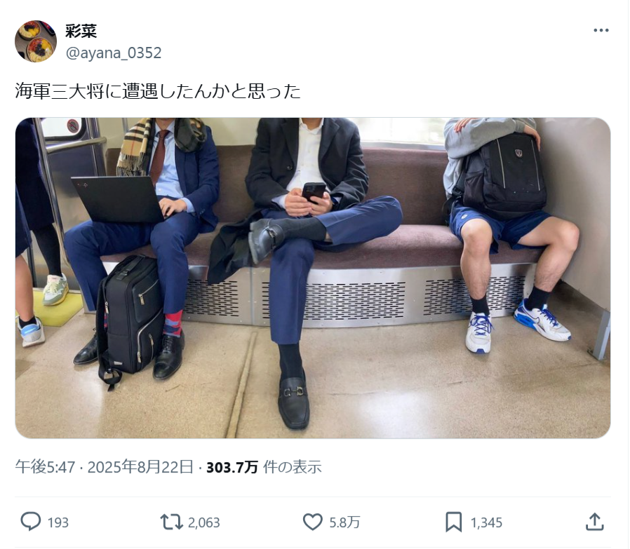 【画像】男さん、電車で「海軍三大将」みたいな座り方をしてしまうwwwww