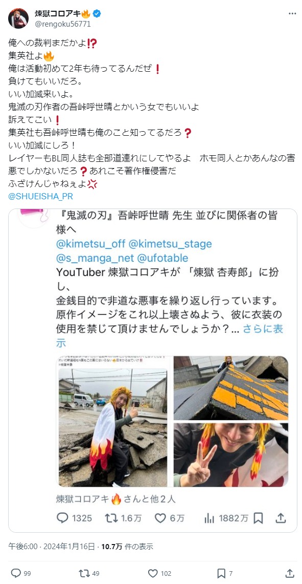 【悲報】煉獄コロアキ、集英社と鬼滅作者を煽る「俺を訴えてこいよ!同人も道連れにしてやるぜ」