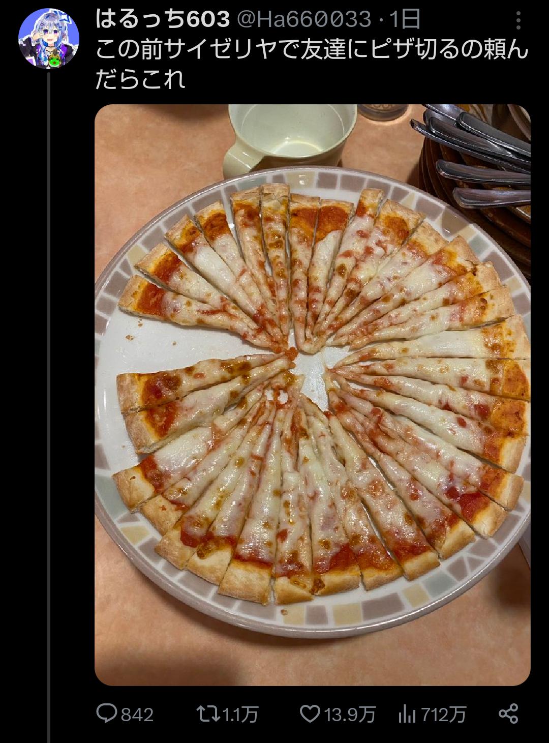 【画像】アニメアイコン「友達のピザの切り方ヤバくて草」パシャッ