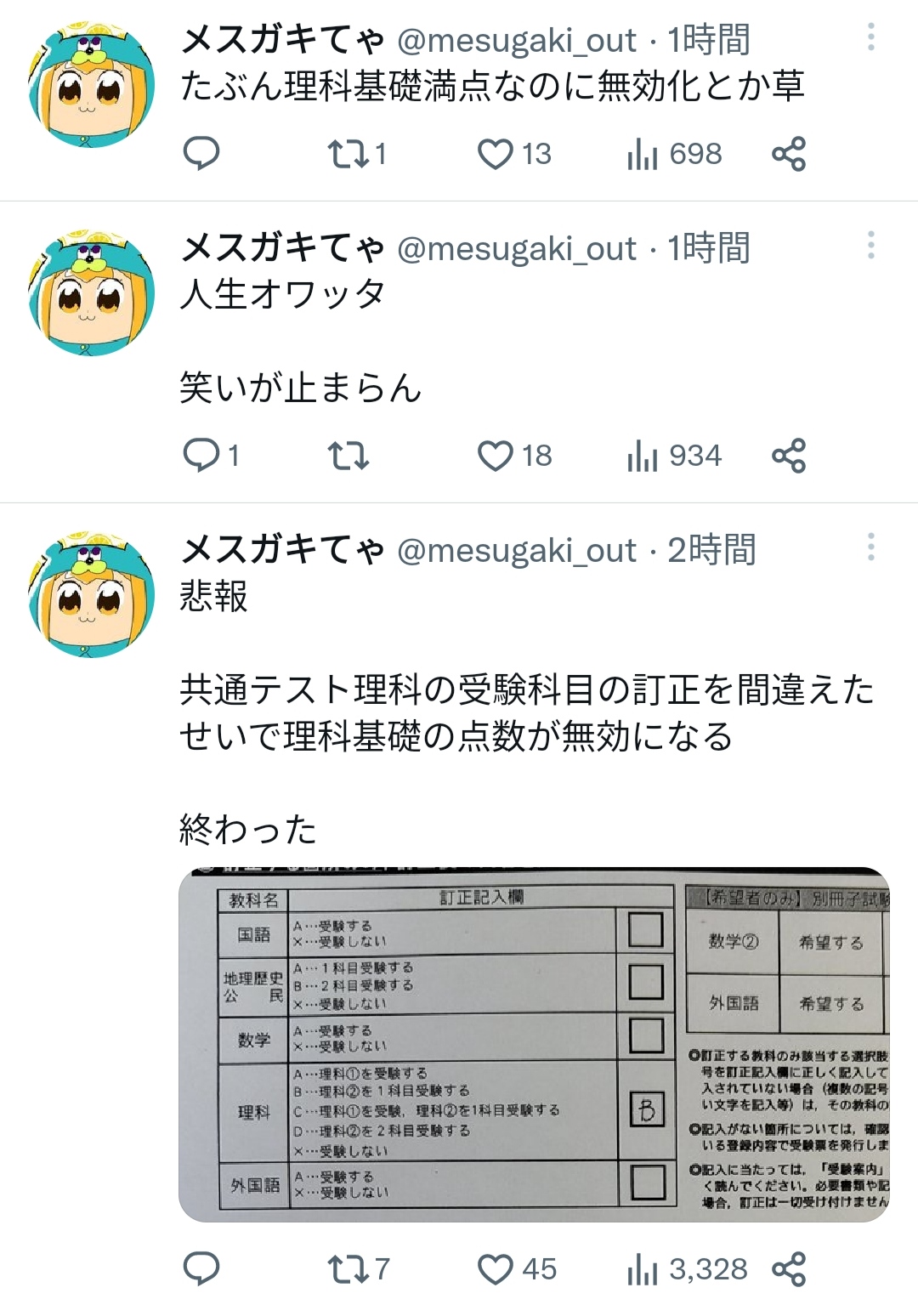 【悲報】共テ理科基礎で「満点」を取ったアニメアイコン、重大ミス発覚で「0点」になってしまうwwwww