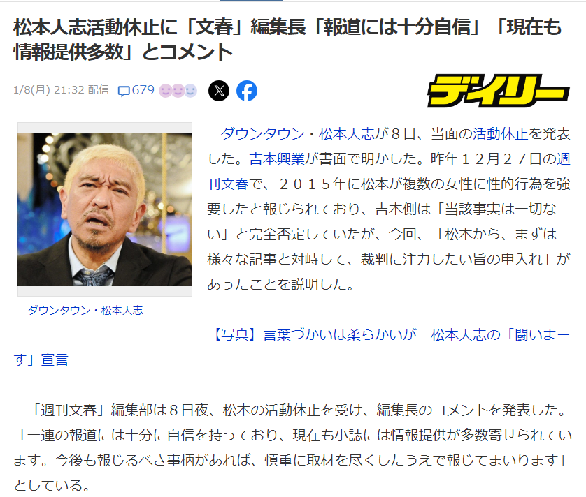 【悲報】松本人志「訴える!覚悟しろ」文春編集長「まだ情報がガンガン来てますよ?」