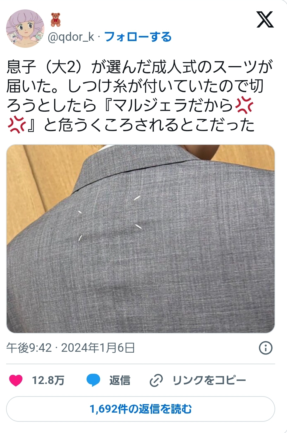 【悲報】アニメアイコン、息子の「高級スーツ(40万円)」のしつけ糸を切りそうになってガチギレされてしまうwwwww