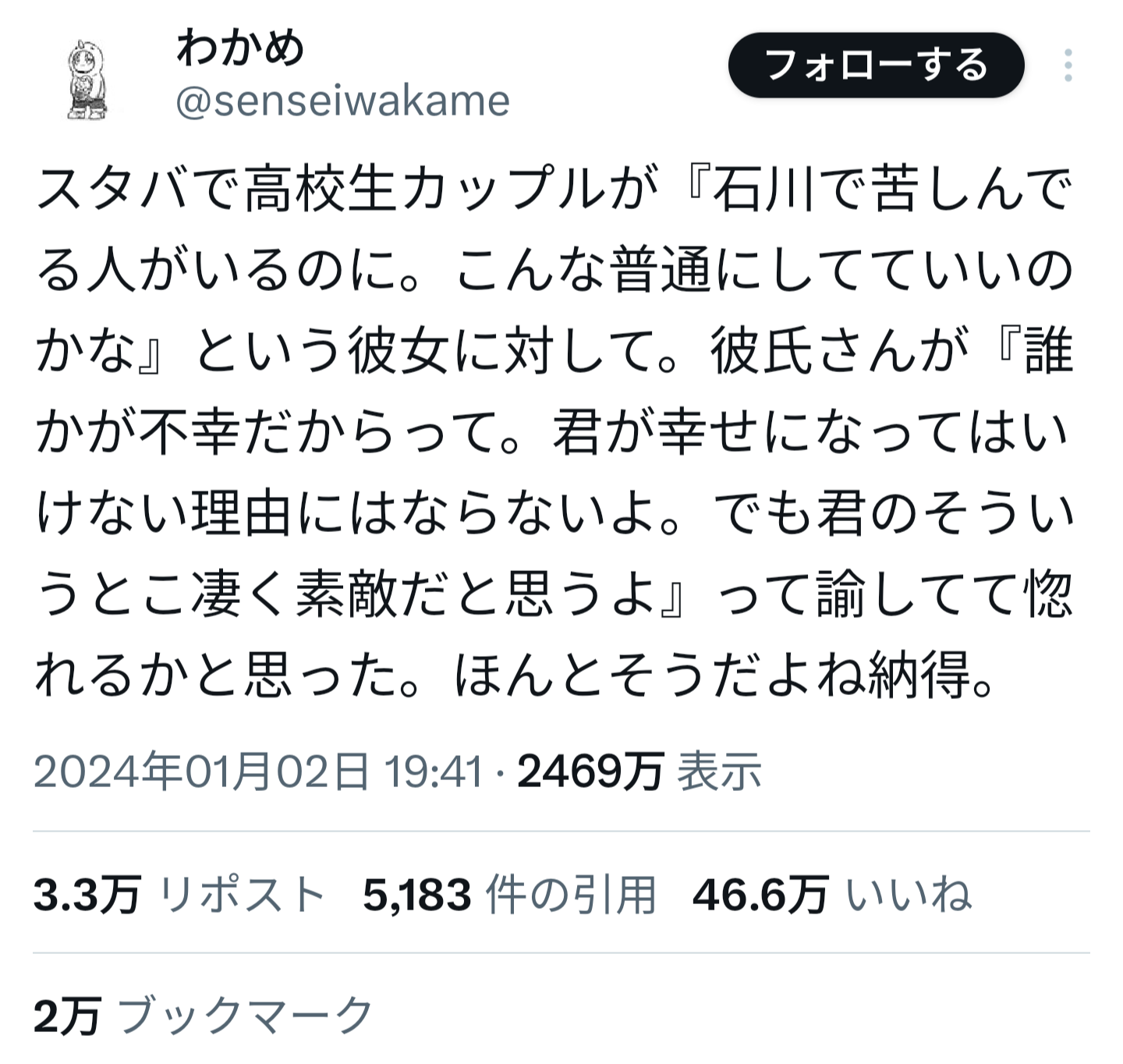 【画像】スタバJK「震災で苦しんでる人がいるのに、普通にしてていいのかな」彼氏「いいんだよ」←46万いいね