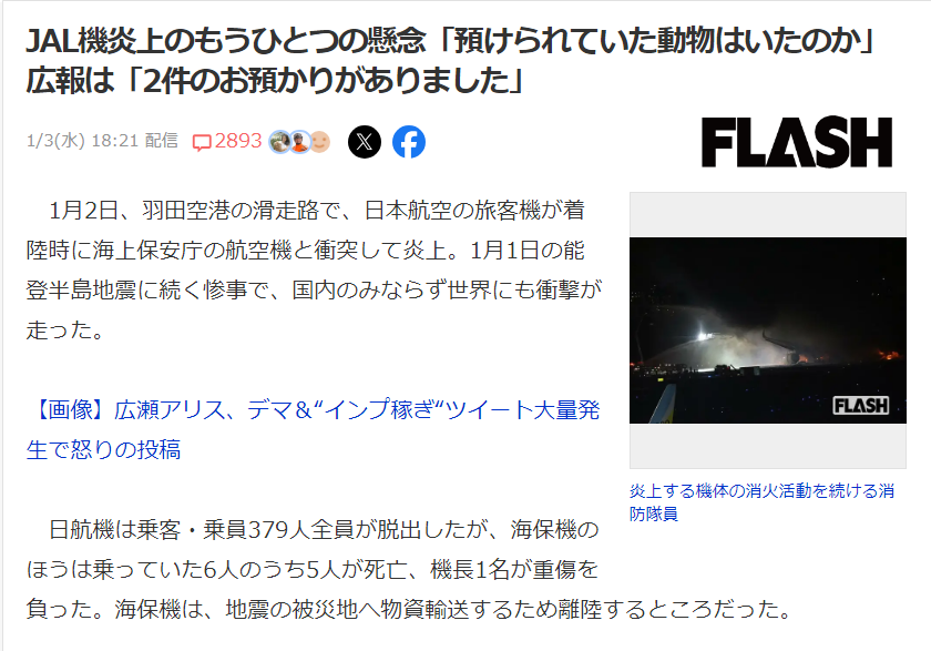 【悲報】JAL機炎上「預けられていた動物はいたの?」→広報「2件のお預かりがありました。」