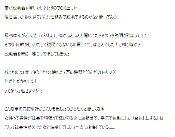 【悲報】妻「7万円の脱毛器買ったw」夫「…どんな仕組みなの?」妻「イヤァァァァァ!!」→破壊へwwwww